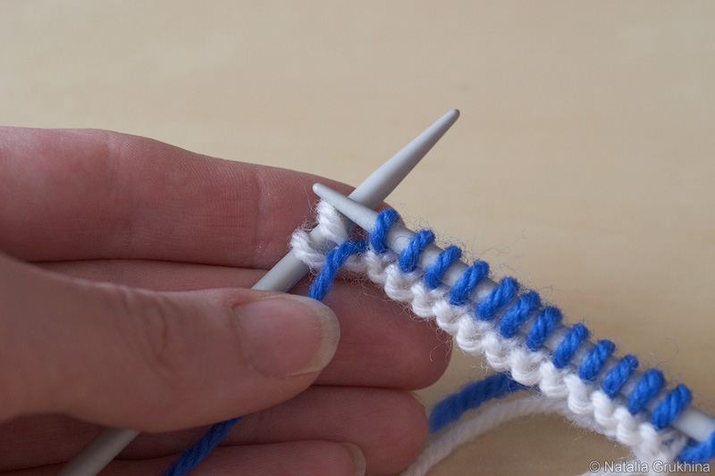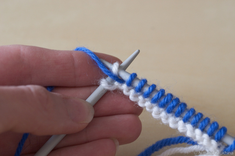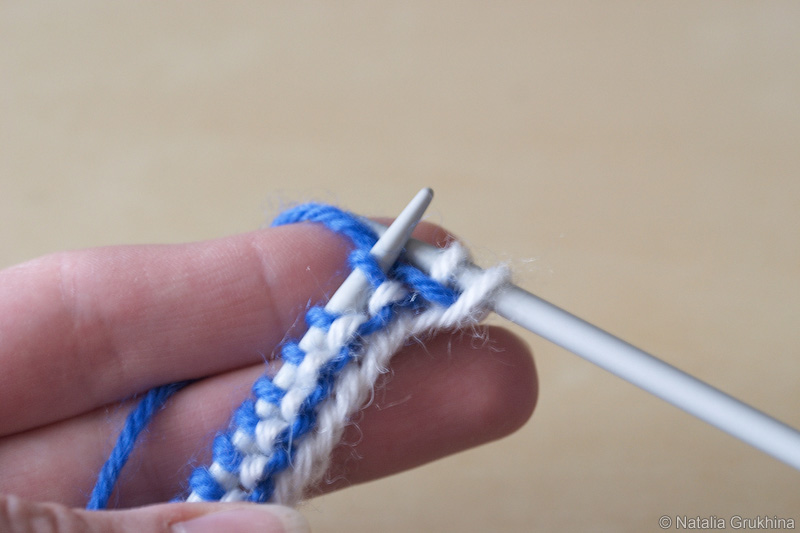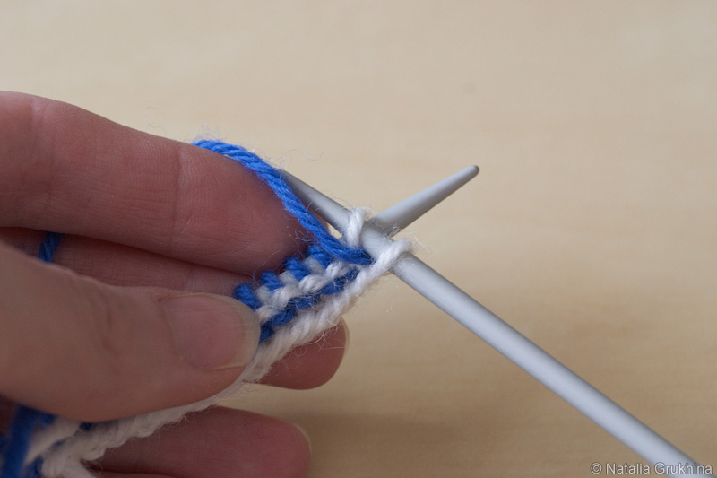 - В каждом изнаночном (нечетном) ряду не провязывать последнюю петлю, а просто снимать ее на левую спицу, предварительно выведя рабочую нить перед вязанием (см. пошаговые фото ниже)