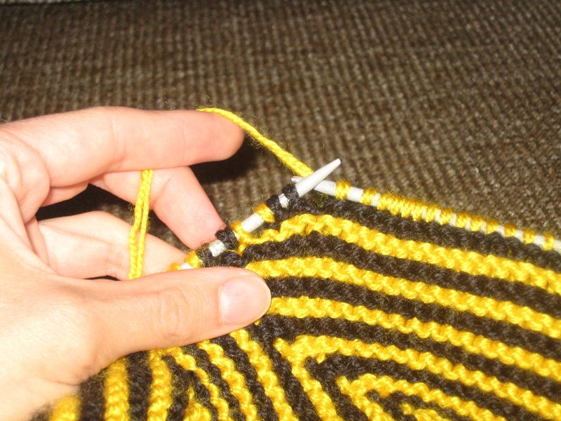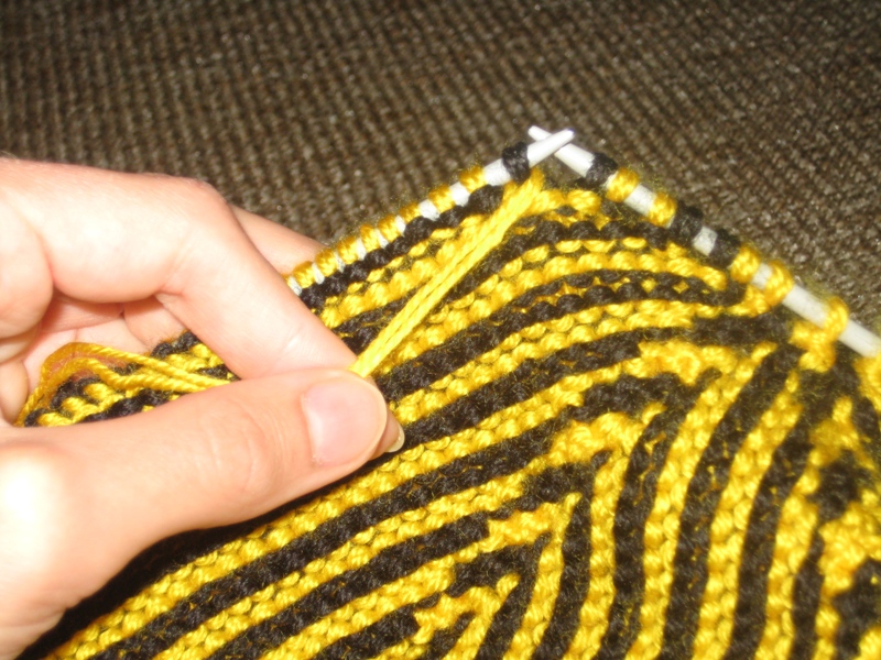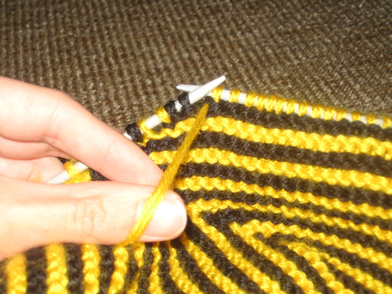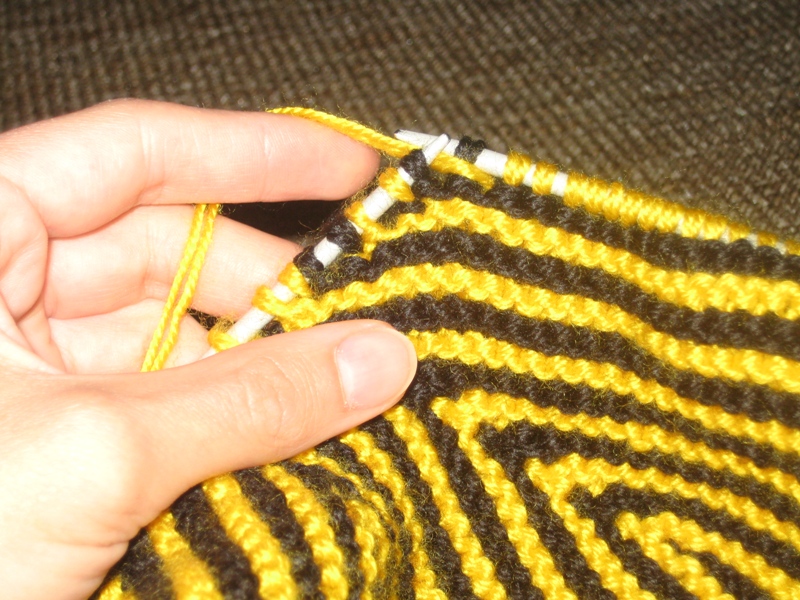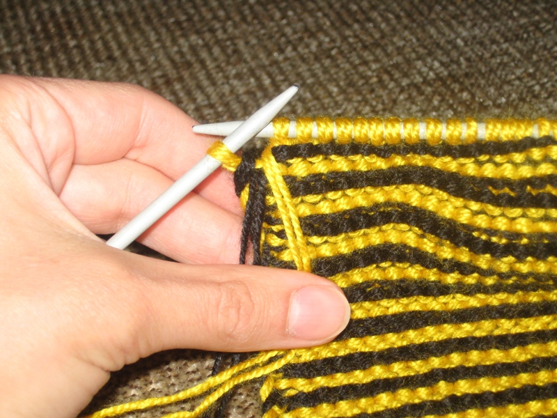 6-19 ряды: вяжем аналогичным образом, т.е. в каждом лицевом ряду недовязываем по 2 петли и чередуем желтую и черную нить каждые 2 ряда.