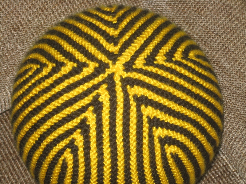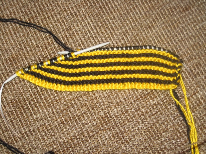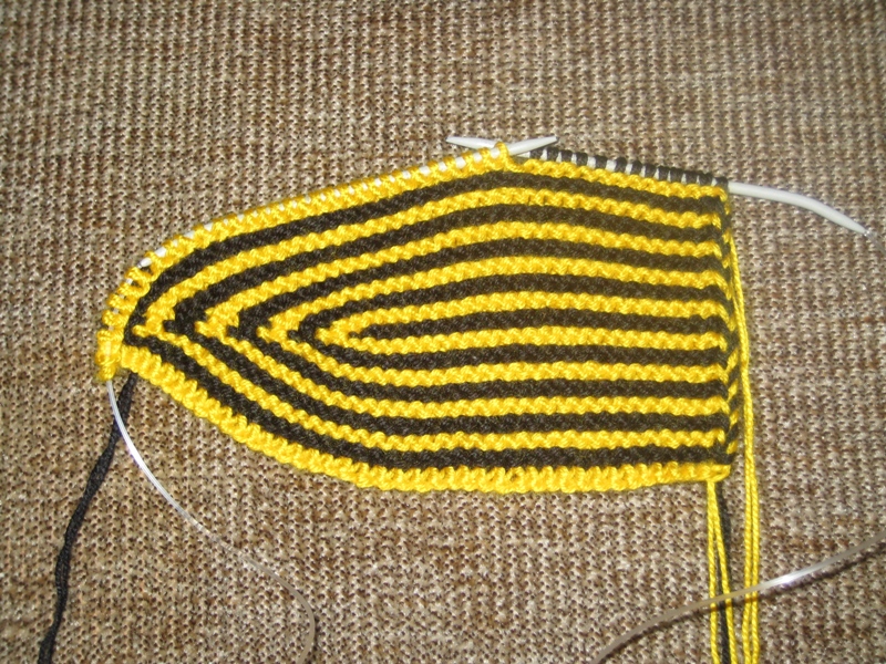 24-37 ряды: вяжем аналогичным образом, чередуя черную и желтую нити и провязывая в каждом лицевом ряду на 2 петли больше, чем в предыдущем.